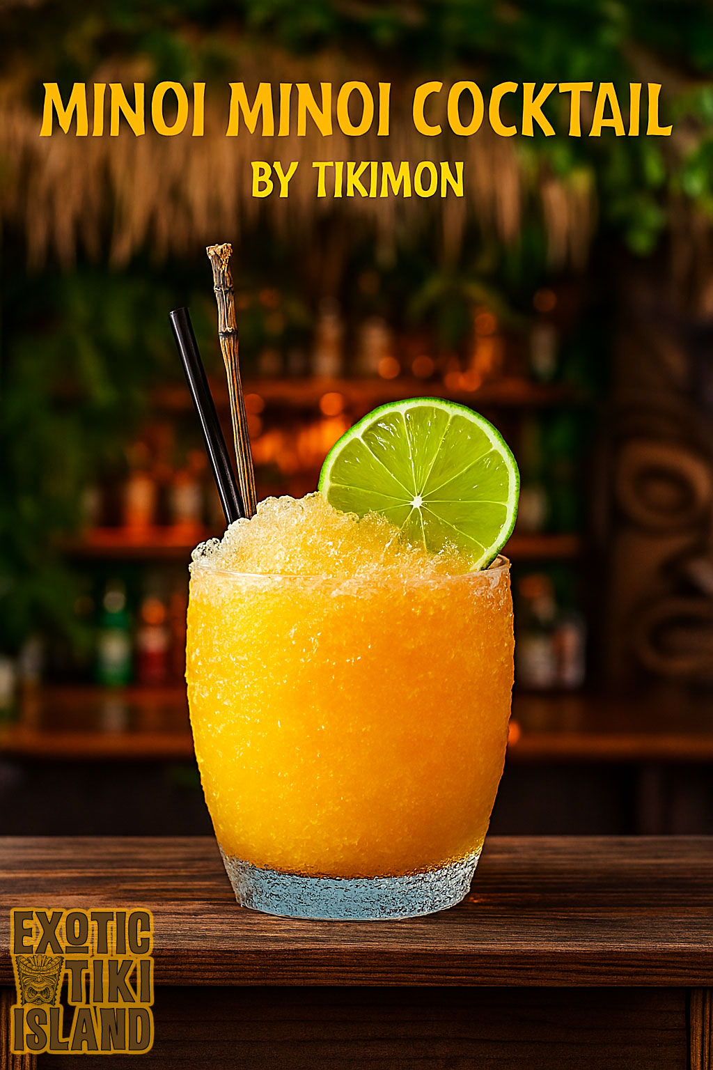 Combine ALL ingredients and flash blend for 5 seconds, pour into your favorite tiki mug or a DOF glass and have at it while you boldly cry out “Minoi Minoi” Eh.